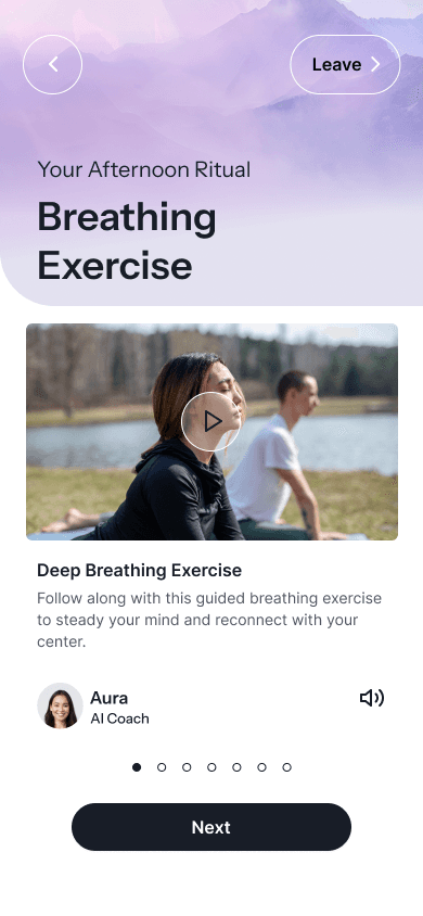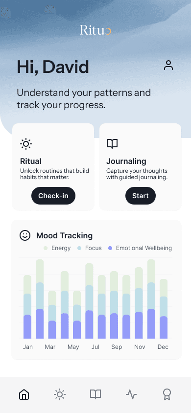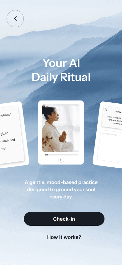 How Rituals Work: Your daily self-care rituals are customizable, time-based experiences. Select routines suggested by the AI or choose from the library. As you complete them, the system responds instantly to confirm and validate your emotions and progress. Set personalized reminders to ensure you never break your new habit streak.