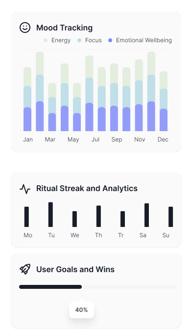 We turn your daily rituals and entries into powerful insights. Get automated daily and weekly summaries that track your mood patterns, wins, and progress toward your goals.